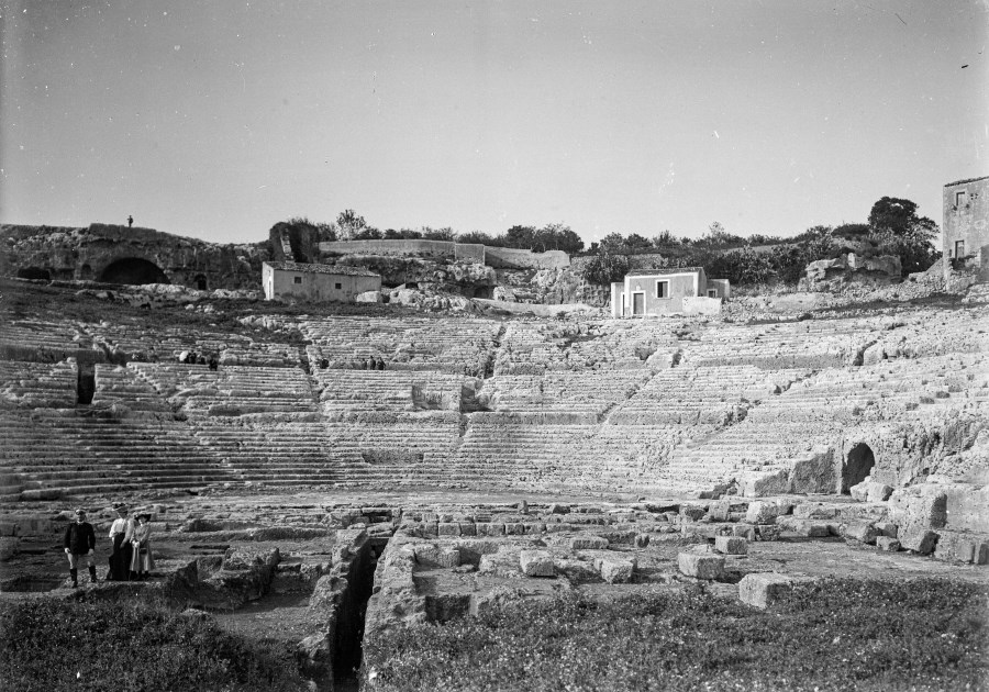 Veduta del Teatro antico di Taormina, in particolare delle tribune e di una parte di cavea; nell'immagine, a sinistra un uomo e due donne in abiti ottocenteschi.
