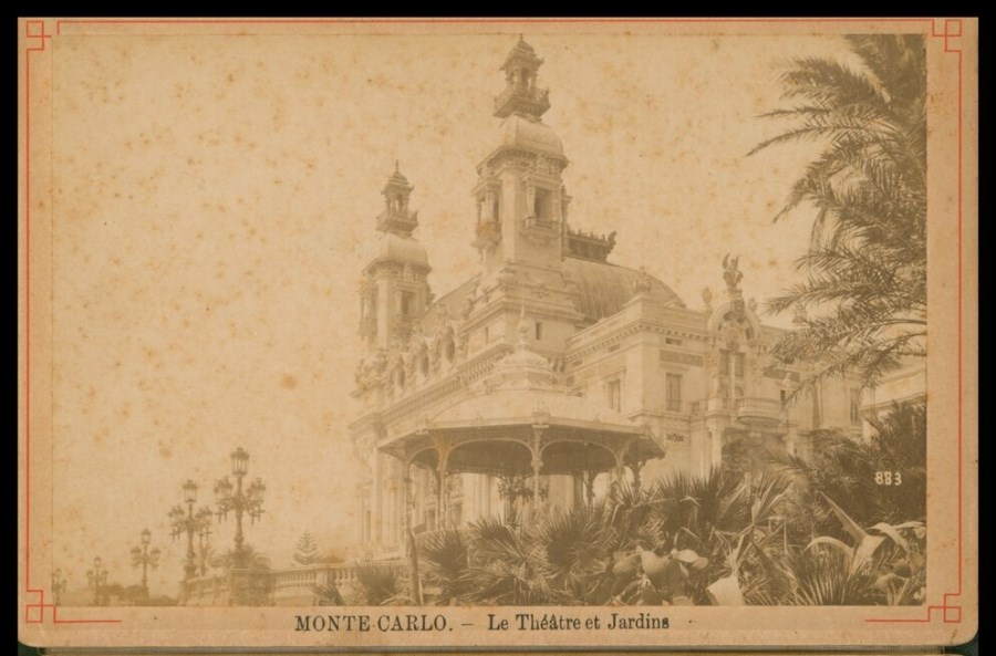 Veduta della facciata del Teatro dell'Opera e parte dei giardini a Monte Carlo in costa Azzurra.