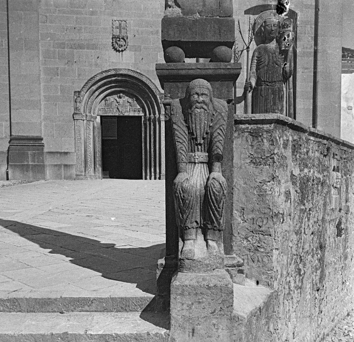 Riproduzione fotografica di uno dei due telamoni di Magister Johannes (1293), detti Pense e Maravèe, all'ingresso del sagrato. Addossati a due pilastri su cui poggiano piramidi secentesche. Furono posti lì nel 1659, quando, in seguito a lavori all’interno della chiesa, fu demolito e disperso il presbiterio, alla cui decorazione le due figure dovevano appartenere.