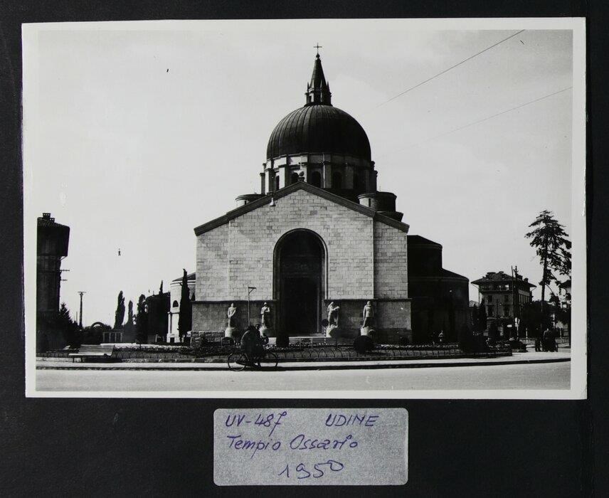 Udine, piazzale XXVI Luglio: facciata del Tempio Sacrario di San Nicolò (Tempio Ossario), progettato da Provino Valle e Alessandro Limongelli nel 1925 e costruito nel 1931. Le quattro statue ai lati dell'ingresso rappresentano il Marinaio, l’Alpino, il Fante e l’Aviatore. I modelli in gesso sono di Silvio Olivo e la lavorazione in pietra è di Luigi Pischiutti.
