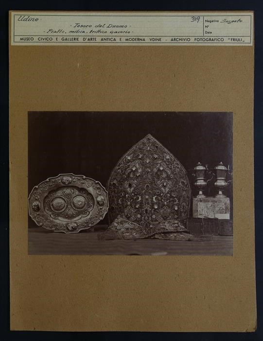 Udine, duomo: da sinistra, piatto in argento con gli Evangelisti in quattro ovali (all'esterno), mitra, trittico in bosso intagliato con raffigurazioni e, dietro di esso, due ampolle argentee.