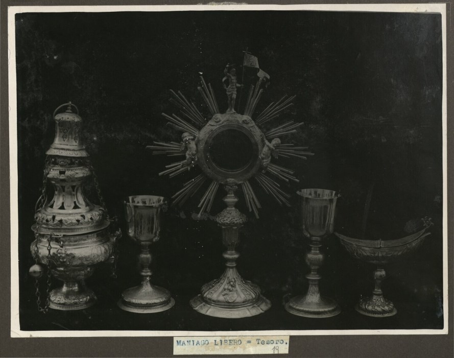 Tesoro conservato presso la Chiesa dei Santi Vito, Modesto e Crescenzia Martiri di Maniago libero su sfondo nero: un turibolo e una navicella per incenso, due calici e un ostensorio.