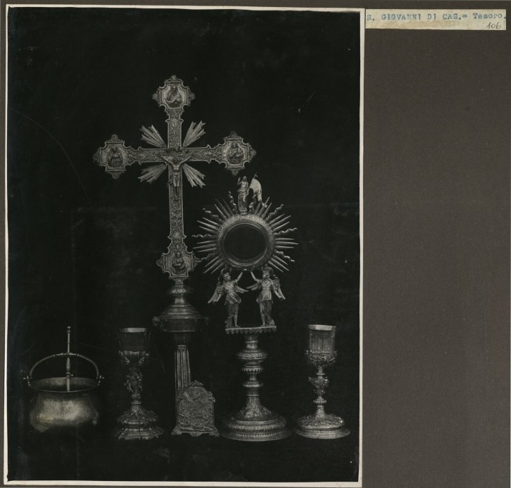 Riproduzione fotografica del tesoro conservato presso la Chiesa di San Giovanni Battista di San Giovanni di Casarsa, frazione di Casarsa della Delizia, composto da un secchiello per l'acqua santa, due calici, un crocefisso ed un ostensorio.