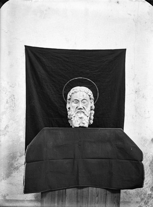 Riproduzione fotografica della testa di una scultura di un Santo posizionata su una struttura con una tela scura per la riproduzione fotografica, probabilmente appartenente al Duomo di Venzone.