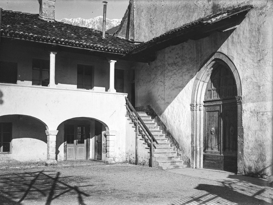 Tipica casa carnica con porticato e loggiato al piano superiore, adiacente alla facciata della Chiesa di San Giovanni Battista. Scatto fotografico effettuato prima del sisma del 1976 che causò il crollo dell'edificio, poi non più ricostruito.