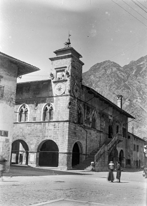 Torre dell'orologio del Palazzo Comunale di Venzone, alcuni passanti in Piazza Municipio e sullo sfondo il Monte San Simeone.
