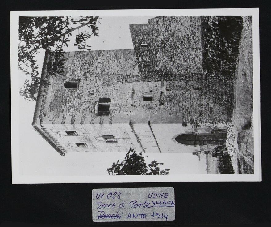Udine: Porta Villalta (1436-1440), quinta cerchia muraria. A sinistra, vicino all'ingresso della porta, alcune persone.