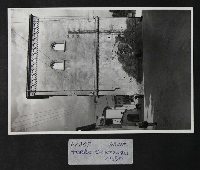 Udine, piazzale Diacono: torre di Porta Anton Lazzaro Moro (quinta cerchia muraria) posizionata alla fine di via Anton Lazzaro Moro, che viene demolita nel 1955 per migliorare la viabilità cittadina.