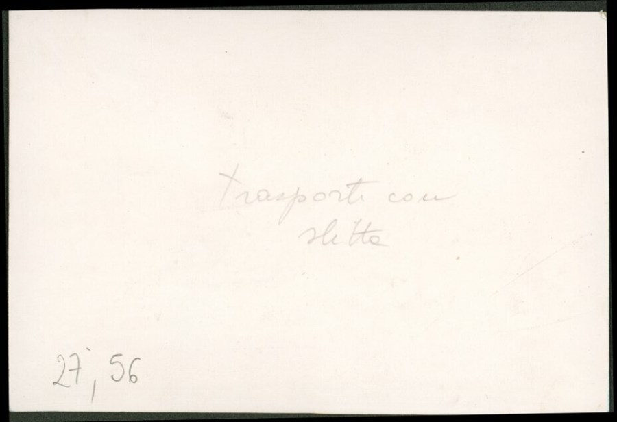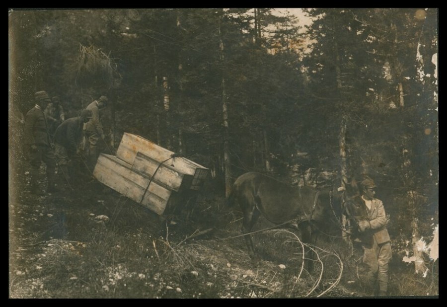 Gruppo di militari intenti a trasportare casse contenenti i resti di caduti di guerra, ricorrendo ad una slitta legata ad un mulo da soma