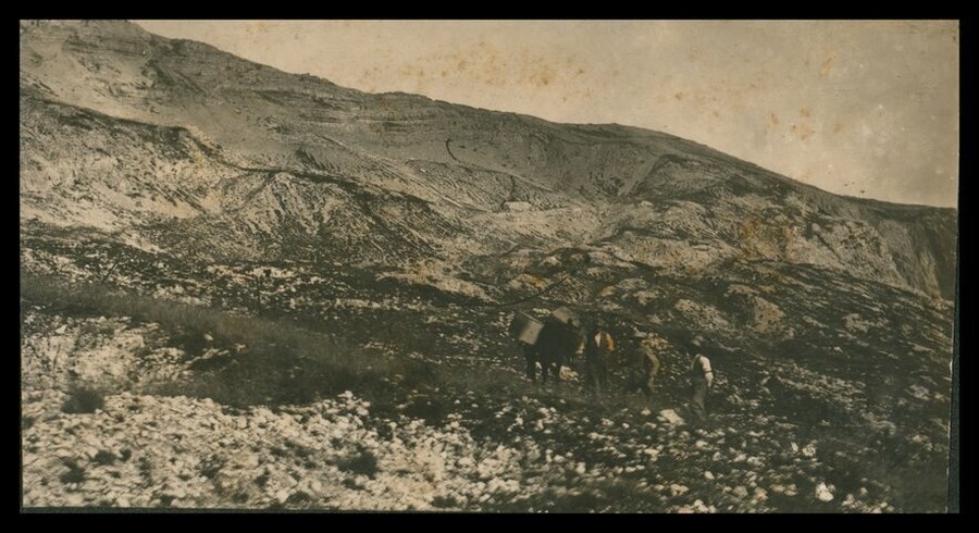 Tre militari trasportano bare a dorso di mulo lungo un pendio di montagna (cfr. foto Scatola 1P 27-47)