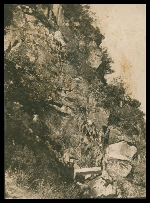 Gruppo di soldati che cala una bara lungo una parete rocciosa