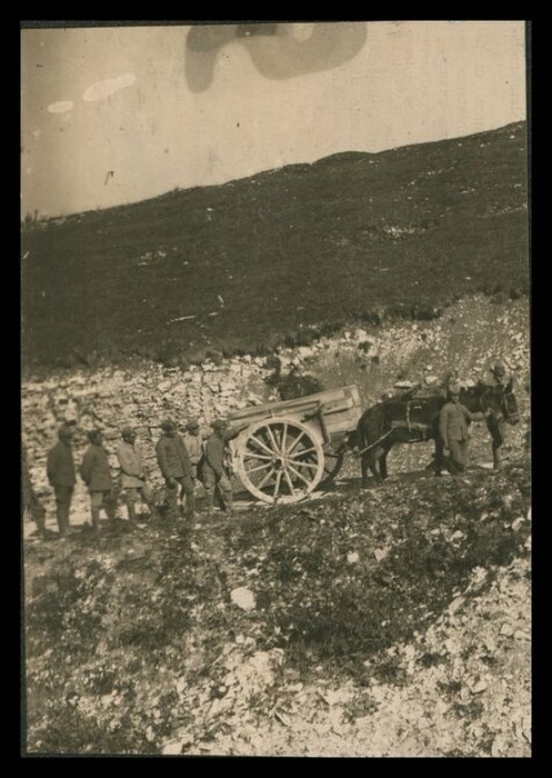 Gruppo di militari accanto ad un carro impegnato nel trasporto delle salme dei caduti della Prima Guerra mondiale