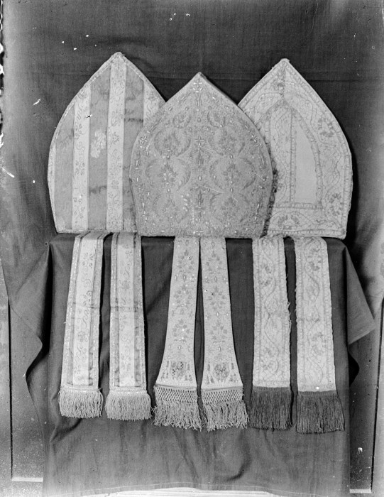 Riproduzione fotografica di tre mitra posizionate su fondale scuro per la riproduzione fotografica.