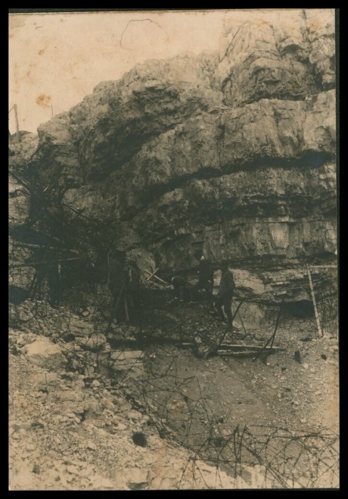 Soldati tra le rocce, all'interno di una trincea abbandonata; sono visibili notevoli cumuli di filo spinato
