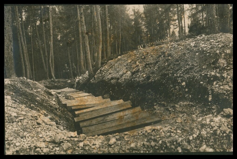 Trincea colma di bare pronte ad accogliere salme di caduti della Prima Guerra Mondiale