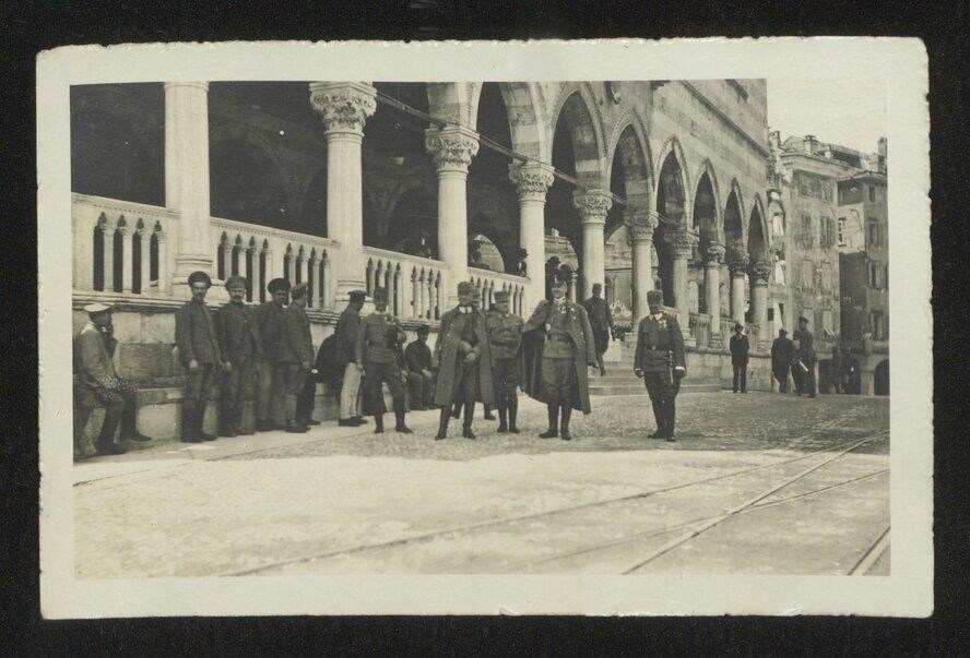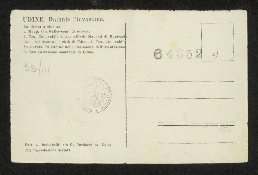 Al rientro dalla cerimonia dell'instaurazione dell'amministrazione comunale di Udine, un gruppo di ufficiali passeggiano davanti alla Loggia del Lionello; come da titolo della cartolina, da destra a sinistra, il maggiore Galler-com di settore, il Tenente Colonnello nobile Alfredo Manussi da Montesole e il Tenente Colonnello Vellentsits.