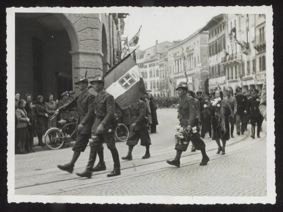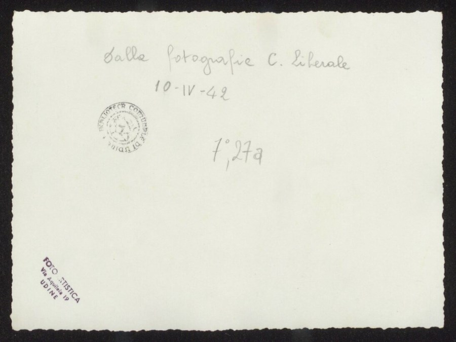 Lo scatto il passaggio della sfilata della bandiera e dei reduci dal fronte greco della "Divisione Julia" lungo Via Mercatovecchio, il 2 aprile 1942. In un articolo del 3/4/1942 su "Il Popolo del Friuli. Organo del Partito Nazionale Fascista", si può leggere il resoconto dell'arrivo in città dei militari e l'immensa folla che li ha accolti e seguiti nel percorso lungo le vie cittadine a partire dalla Stazione. Una didascalia sul verso della foto, data erratamente l'immagine al 10 aprile 1942.