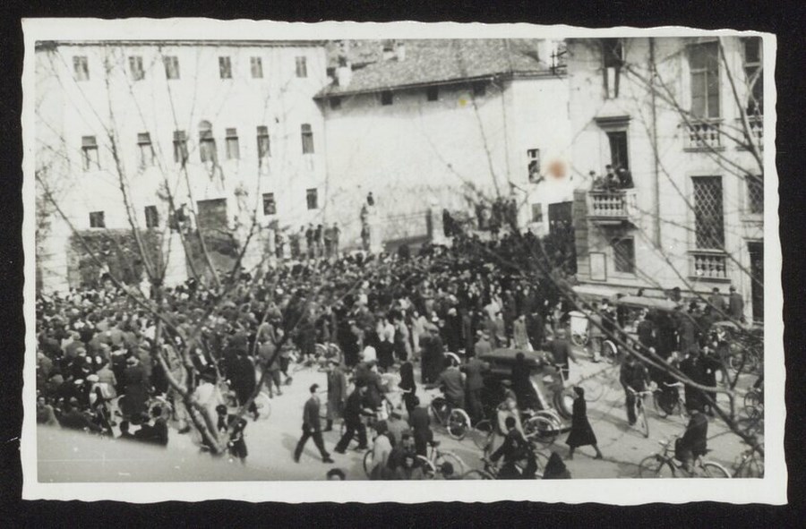 La folla in attesa del passaggio dei reduci dal fronte greco della "Divisione Julia" alla fine di Via Aquileia e all'imbocco di Via Vittorio Veneto, il 2 aprile 1942. L'articolo del 3/4/1942 su "Il Popolo del Friuli. Organo del Partito Nazionale Fascista", recita come nel percorso lungo le vie cittadine dell'8° reggimento a partire dalla Stazione «all'imbocco di via Vittorio Veneto la strada è addirittura ostruita: con una certa fatica si riesce a fare un po' di largo e, fino in piazza Vittorio Emanuele, la colonna deve farsi sottile sottile per poter passare».