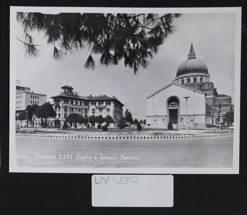 Udine: veduta di piazzale XXVI Luglio con un'aiuola. A destra, il Tempio Sacrario di San Nicolò (Tempio Ossario), progettato da Provino Valle e Alessandro Limongelli nel 1925 e costruito nel 1931. Le quattro statue ai lati dell'ingresso rappresentano il Marinaio, l’Alpino, il Fante e l’Aviatore; i modelli in gesso sono di Silvio Olivo e la lavorazione in pietra è di Luigi Pischiutti. A sinistra, Palazzo Moretti, annesso allo stabilimento del Birrificio Moretti, progettato dall'architetto Ettore Gilberti (1925-1926). In basso a sinistra, didascalia stampata: "Udine - Piazzale XXVI Luglio e Tempio Ossario".