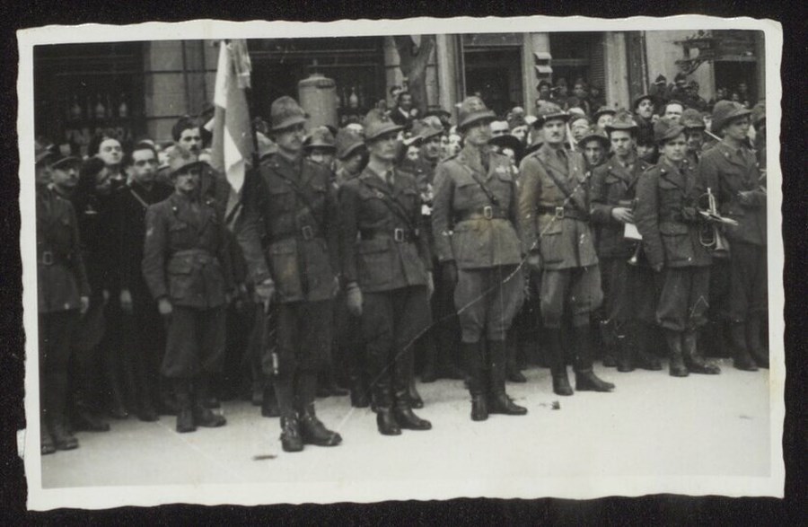 L'arrivo della bandiera e dei reduci dal fronte greco della "Divisione Julia" a Udine, il 2 aprile 1942. Nell'immagine, Alpini sull'attenti, tra cui verosimilmente il comandante dell'8° Reggimento, accanto e dietro al militare che sorregge la bandiera. Sulla destra dell'inquadratura si vedono Alpini appartenenti alla banda, che dall'articolo del 3/4/1942 su "Il Popolo del Friuli. Organo del Partito Nazionale Fascista", sappiamo aver preceduto la bandiera nella sfilata.