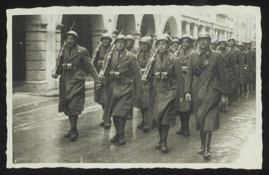 La sfilata dei reduci dal fronte greco della "Divisione Julia" a Udine, il 2 aprile 1942, qui lungo via Vittorio Veneto. Dall'articolo del 3/4/1942 su "Il Popolo del Friuli. Organo del Partito Nazionale Fascista", oltre a venire a sapere del grande entusiasmo e della calorosa accoglienza della città, veniamo informati anche che «precedono i Vigili Urbani, quindi la banda, quindi la bandiera con il comandante di reggimento e la scorta d'ordinanza alla quale si sono aggiunte le consorti di due ufficiali che recano grandi mazzi di fiori. Viene poi il gruppo delle Autorità e degli ufficiali reduci dal fronte greco e, per ultima, la compagnia reggimentale».
