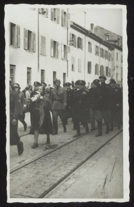 La sfilata dei reduci dal fronte greco della "Divisione Julia" a Udine, il 2 aprile 1942, dalla Stazione lungo via Aquileia. Dall'articolo del 3/4/1942 su "Il Popolo del Friuli. Organo del Partito Nazionale Fascista", oltre a venire a sapere del grande entusiasmo e della calorosa accoglienza della città, veniamo informati anche che «precedono i Vigili Urbani, quindi la banda, quindi la bandiera con il comandante di reggimento e la scorta d'ordinanza alla quale si sono aggiunte le consorti di due ufficiali che recano grandi mazzi di fiori. Viene poi il gruppo delle Autorità e degli ufficiali reduci dal fronte greco e, per ultima, la compagnia reggimentale».