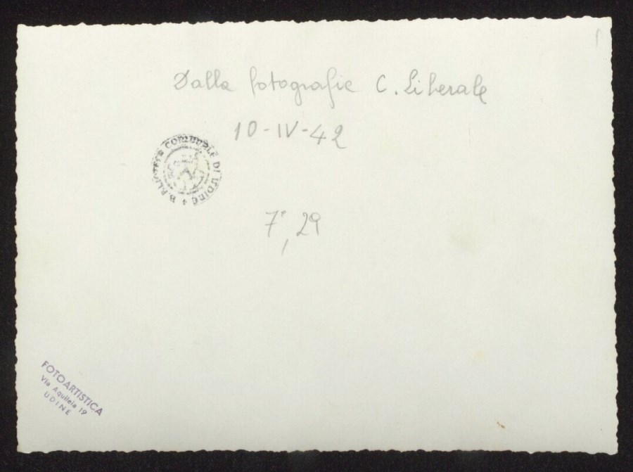 L'uscita della bandiera della "Divisione Julia" sul piazzale della Stazione di Udine, tra ali di folla civile e militare; sulla destra si vede la banda musicale. L'iscrizione sul verso della fotografia fa risalire lo scatto al 10 aprile 1942, anche se più probabilmente si tratta del 2 aprile 1942, come desumibile dall'articolo pubblicato il 3/4/1942 su "Il Popolo del Friuli. Organo del Partito Nazionale Fascista".