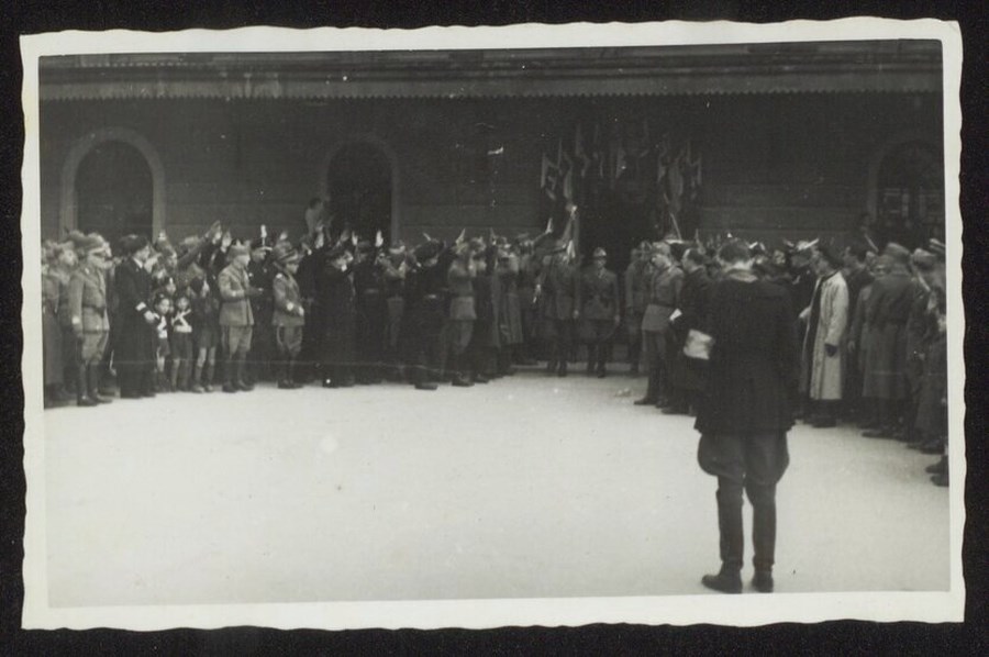 L'uscita della bandiera della "Divisione Julia" dalla Stazione di Udine, tra due ali di folla in attesa. L'articolo del 3/4/1942 su "Il Popolo del Friuli. Organo del Partito Nazionale Fascista", riporta dettagliatamente il grande entusiasmo e la calorosa accoglienza della città agli alpini dell'8° reggimento.