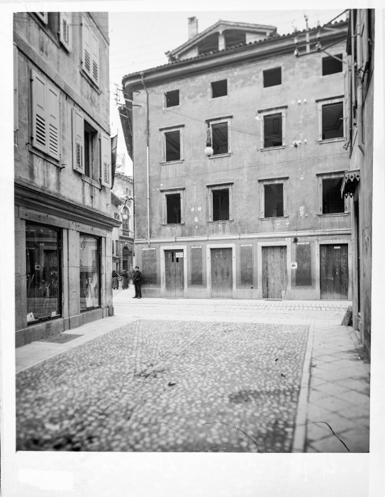 Veduta del crocevia cittadino tra via Savorgnana e via Cavour, con le "case Cortelazis" prima della demolizione nel 1910 per la costruzione di Palazzo D'Aronco, nuova sede del Municipio di Udine. Sulla sinistra dell'immagine si vede un negozio di confezione d'abiti, con le due vetrine affacciate su via Savorgnana; un ragazzo incuriosito per lo scatto è fermo all'incrocio; dietro di lui, in via Lionello, si intravedono due donne e persone in movimento. L'edificio nello scorcio della visuale, sullo sfondo, è Palazzo Rubazzer in via Lionello, che ospitava, oltre al caffè "Alla Nave", anche la centrale del telefono pubblico, come denota l'insegna che recita "Posta telefonica pubblica". L'edificio destinato all'abbattimento si mostra già svuotato e privo di finestre; i negozi che erano presenti al piano terra già trasferiti: sulle travi di legno che chiudono la porta d'accesso di uno di questi si legge del suo trasloco in Via Portanuova n. 5.