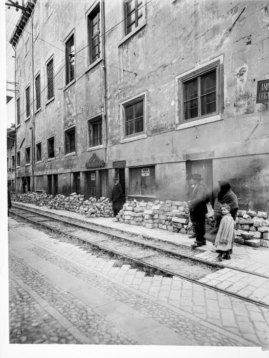 Veduta di via Cavour, con la facciata del vecchio palazzo municipale: progettato da Sansovino, ultimato nel 1578, venne demolito nel 1910 per l'edificazione di Palazzo D'Aronco, nuova sede degli uffici comunali. Lo scatto risale ai momenti appena precedenti la demolizione. Al pianterreno del vecchio palazzo vi erano negozi ed uffici, ed infatti nell'immagine si vede l'insegna ancora in loco del barbiere Augusto Flumiani con l'avviso sulla porta che comunica il trasferimento del negozio in Piazza del Duomo. L'uomo con il cappello con visiera (un usciere comunale?) è davanti all'ingresso dell'ufficio di "Amministrazione Legati del Comune" mentre sulle assi di legno c'è l'avviso del suo trasferimento al n.10 della stessa via. Addossate al palazzo, lastre in pietra utilizzate per il riempimento della pavimentazione tra i binari della rete tramviaria urbana. A destra due uomini e una donna con una bambina per mano; a sinistra un uomo affacciato ad una finestra del primo piano.
