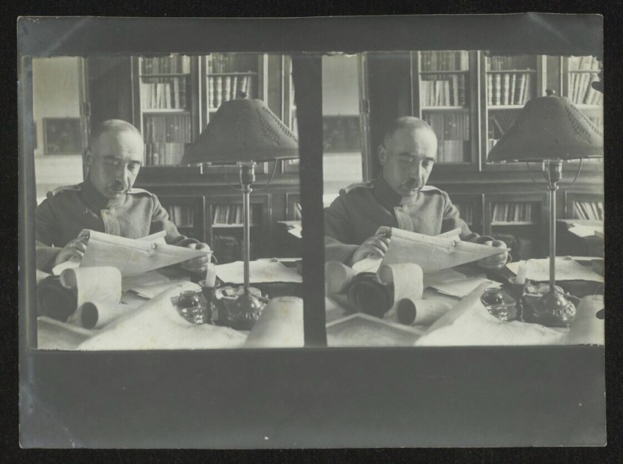 Ritratto di un ufficiale tedesco, probabilmente Walter Mannowsky o Walter Gràff, a capo della Commissione tedesca denominata "Kunstschutzgruppe", seduto ad una scrivania nella Sala Antonini della Biblioteca Civica Vincenzo Joppi. La suddetta commissione, tedesca e austro-ungarica, si occupò della protezione del patrimonio artistico in Friuli Venezia- Giulia tra il novembre 1917 e 1918. L'immagine, doppia, è probabilmente un provino a contatto.