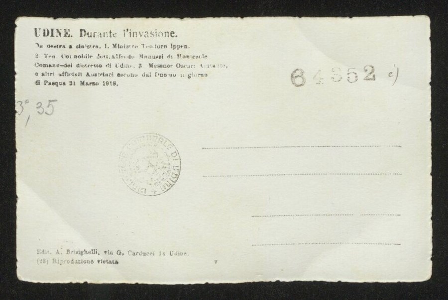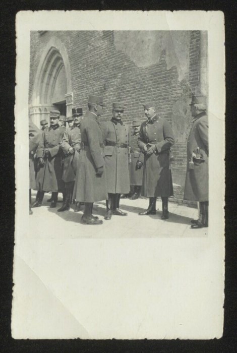 Ritratto di uomini d'arme, studiosi e nobili: da destra, il Ministro Theodor Anton Ippen, il Tenente colonnello nobile dott. Alfredo Manussi di Montesole Comune del distretto di Udine, Messmer Oscar e altri ufficiali austriaci mentre escono dal Duomo di Udine nel giorno di Pasqua, il 31 Marzo 1918..