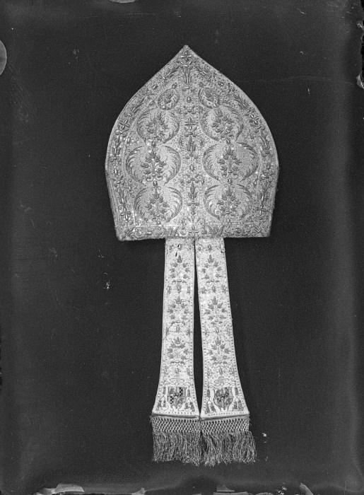 Riproduzione fotografica di una mitra con motivi floreali e, al termine delle fasce, sono ricamati due stemmi.