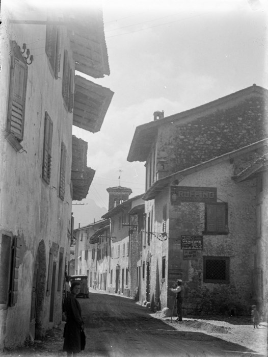 Veduta di una via di Venzone: fra i tetti spunta il campanile della Chiesa di Santa Chiara già Santa Maria a Venzone, crollata durante il terremoto del 1976 e non più ricostruita. Alcuni passanti ritratti dal fotografo.