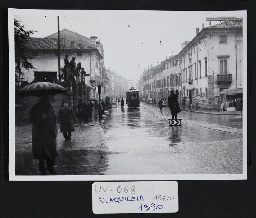 Udine: veduta di via Aquileia durante una giornata piovosa. Diverse persone camminano lungo la via con l'ombrello. Al centro, il tram. All'inizio della strada, un vigile urbano in piedi sulla pedana. A sinistra, quattro sculture in pietra poste sulle colonne della recinzione all'ingresso di Palazzo Pontoni, all'angolo tra via Piave e via Aquileia. Accanto, Palazzo Rubini (presumibilmente di origine quattrocentesca). A destra, Casa de Rubeis-Perusini, con la facciata su via Gorghi che presenta finestre balaustrate. Il palazzo, che propone gli stilemi degli primi anni del XVIII secolo, aveva anche ospitato il Cinema Moderno, chiuso nel 1962. Accanto, Palazzo Trento-Girardis, in origine degli Antonini, a tre piani con trifora al centro.