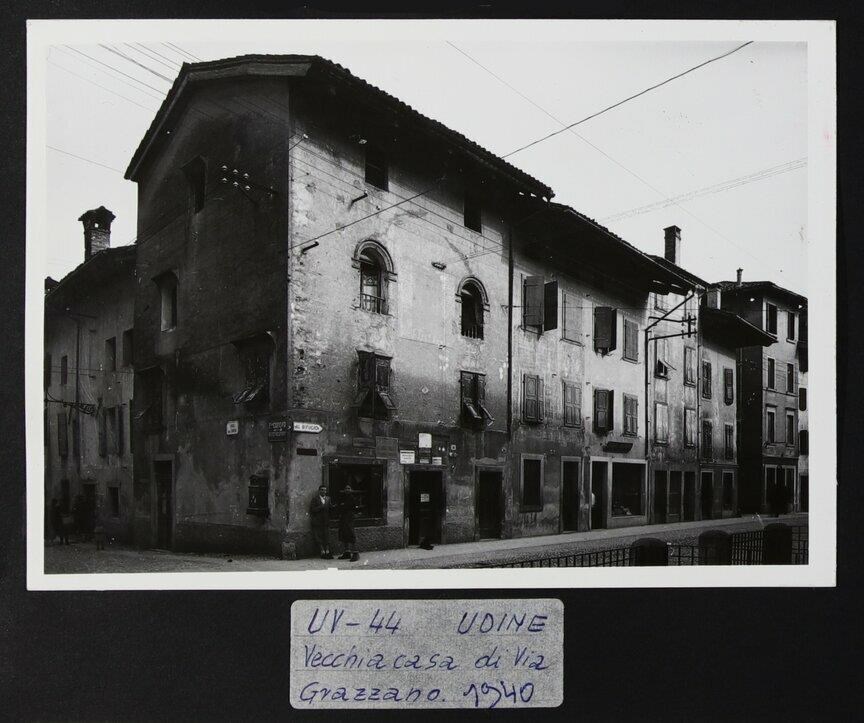 Udine, via Grazzano: veduta un'abitazione (forse di origine cinquecentesca) con due finestre ad arco in stile lombardo, tipico delle case disposte lungo la via. In basso, un signore e una signora guardano verso l'obiettivo. Si può leggere un'indicazione stradale per "Al Rifugio":