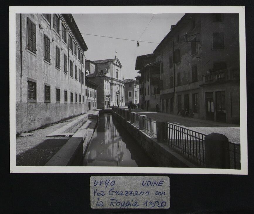 Udine: veduta di uno scorcio di via Grazzano, con la roggia di Udine. In fondo, al centro, la facciata della chiesa di San Giorgio Maggiore (di origine trecentesca). L'assetto risale al periodo compreso tra la seconda metà del Settecento e il 1831.
