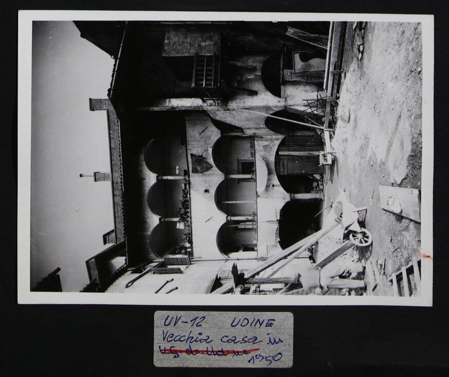 Udine: veduta di un'abitazione a tre piani con portico, solai e loggiato; all'esterno, si trovano diversi attrezzi. A sinistra, un signore che sta lavorando; accanto, una cariola. In basso a sinistra, una scala di legno.