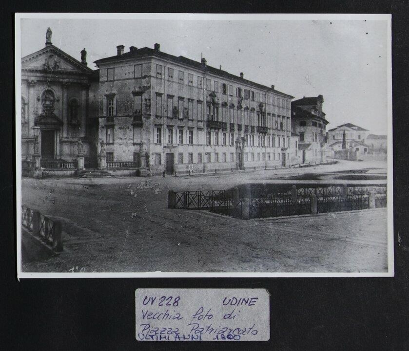 Udine, piazza Patriarcato: veduta del palazzo Patriarcale o Arcivescovile (degli inizi del Settecento) in prospettiva e di altri edifici. In primo piano, la roggia di Palma. A sinistra, la chiesa di Sant'Antonio Abate, con la facciata settecentesca di Giorgio Massari.