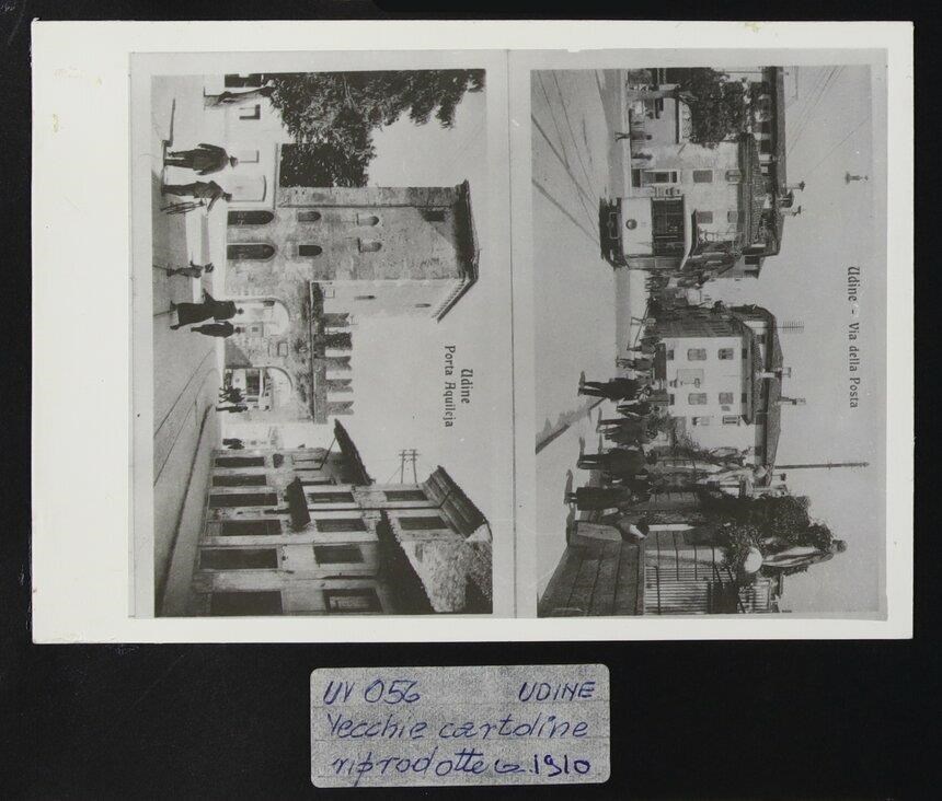 Udine: due cartoline riprodotte che rappresentano scatti di via della Posta e Porta Aquileia. Nella prima (in alto), diverse persone camminano lungo la via; verso sinistra, il tram; a destra, le quattro sculture in pietra poste sulle colonne della recinzione all'ingresso di Palazzo Pontoni, all'angolo tra via Piave e via Aquileia.