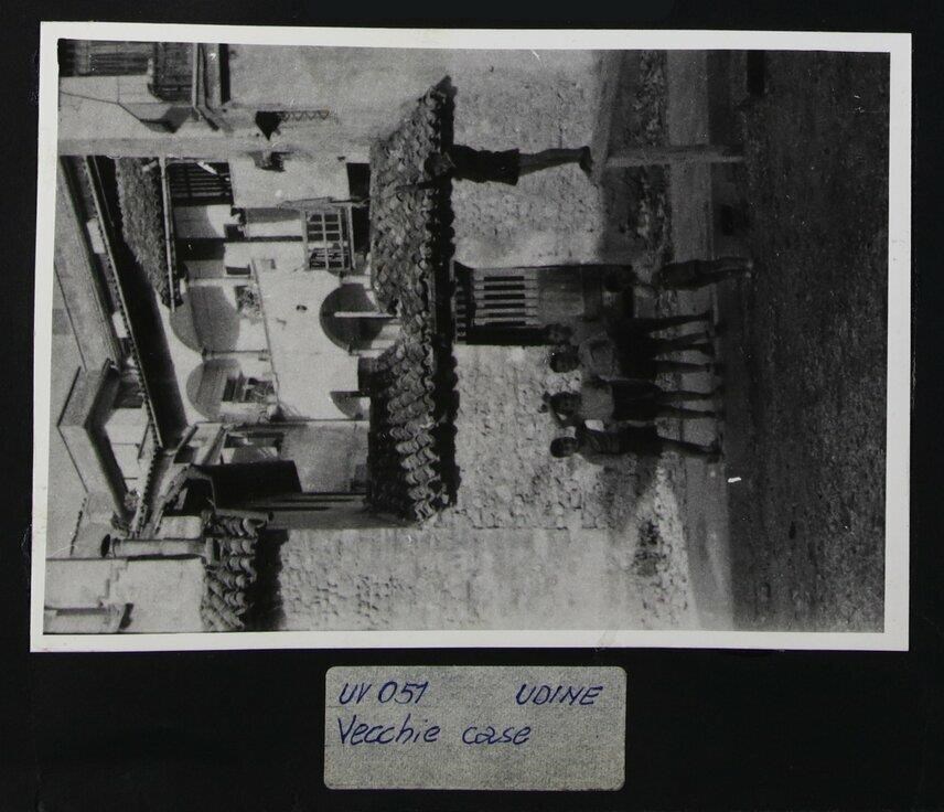 Udine: gruppo di sei bambini in posa per la fotografia (quattro maschi e due femmine) davanti a delle case. Uno di loro è isolato dagli altri, tiene il braccio destro sollevato e si trova su una piccola struttura in legno sopraelevata.