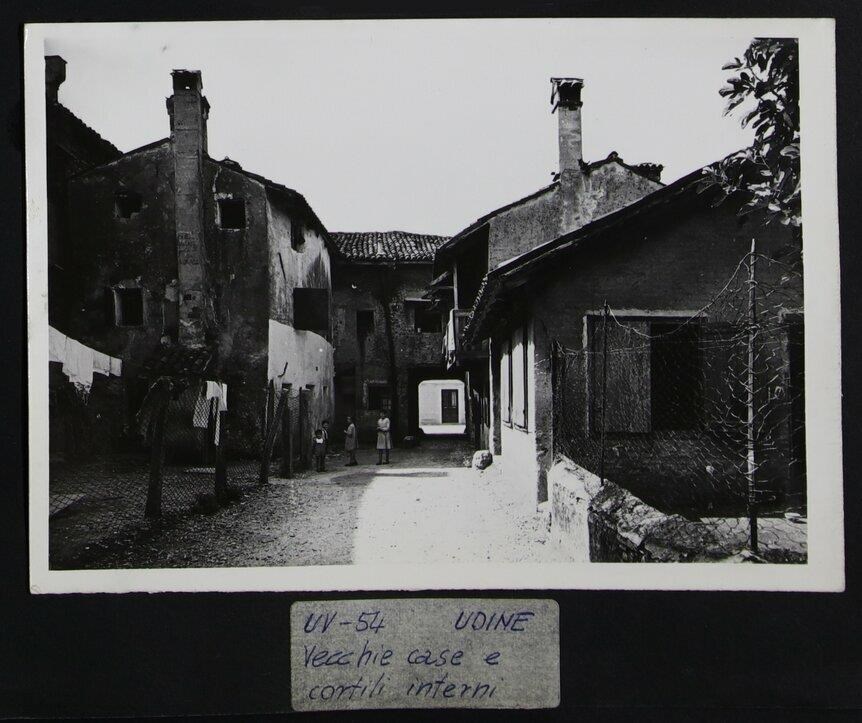 Udine: veduta di vecchie abitazioni con cortili interni. Nello scatto sono ritratte tre bambine e una donna. A sinistra, dei panni stesi sulla recinzione.