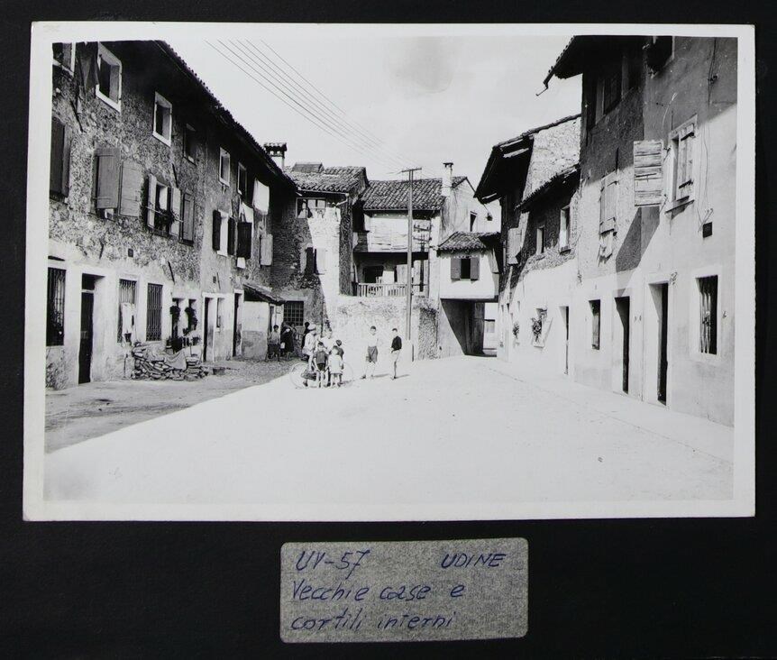 Udine: veduta di vecchie abitazioni con cortili interni. Al centro, nove bambini e una signora.
