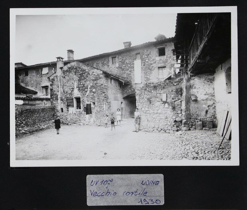 Udine: veduta di un cortile interno, circondato da vecchie abitazioni, in cui sono presenti tre bambine e due bambini.