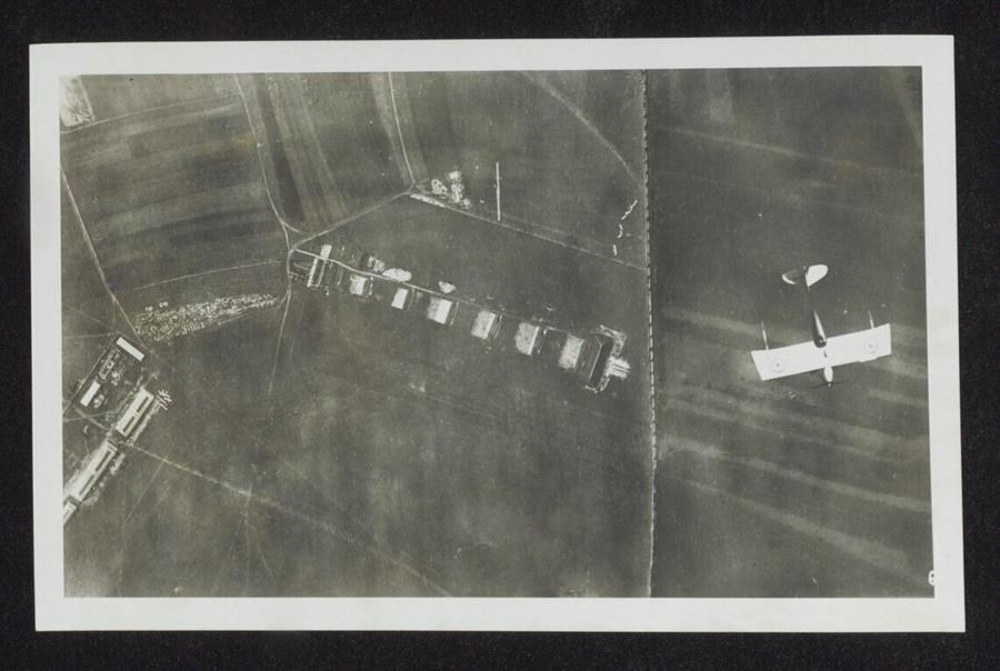 Veduta aerea di alcuni edifici rurali e appezzamenti di campi agricoli. A destra la veduta dall'alto di un aeroplano monoposto SVA 5. L'immagine si inserisce nelle fotografie scattate per il volo su Vienna del 9 agosto 1918: una trasvolata compiuta da otto piloti dell'87ª Squadriglia aeroplani da Caccia “La Serenissima”, ideata dal poeta italiano Gabriele D'Annunzio, con la quale vennero lanciati nel cielo di Vienna migliaia di manifestini tricolori contenenti una provocatoria esortazione alla resa e a porre fine alle belligeranze.