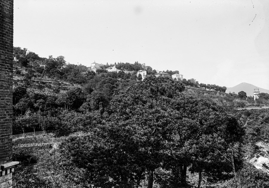 Veduta di alcune abitazioni immerse nella vegetazione collinare; il punto di ripresa proviene probabilmente dalla terrazza di una delle ville adiacenti.