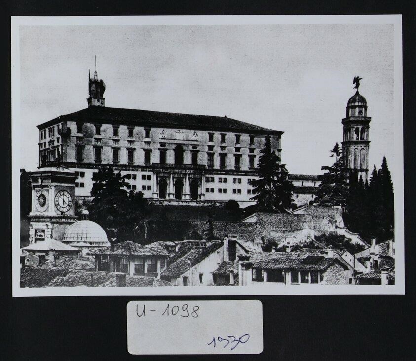 Udine: veduta con, in secondo piano, il castello e il campanile cinquecentesco della chiesa di Santa Maria di Castello progettato da Gaspare Negro, con la scultura dorata e girevole rappresentante l'arcangelo Gabriele, in cima alla cupola emisferica portata a termine da Giovanni da Udine. A sinistra, la Torre dell'Orologio di Giovanni da Udine (1527) che si innesta sulla Loggia di San Giovanni.