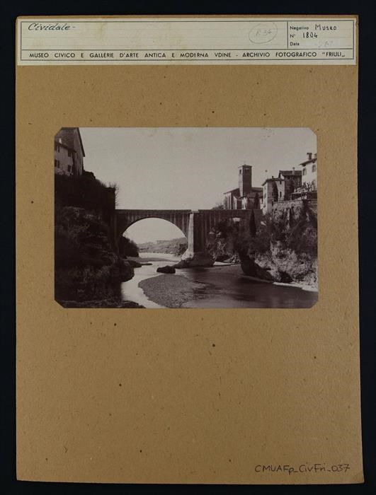 Cividale del Friuli: il Ponte del Diavolo (risalente al Quattrocento e oggetto di restauro nel 1842) sul fiume Natisone e, sulla destra, si intravede la chiesa di San Martino.