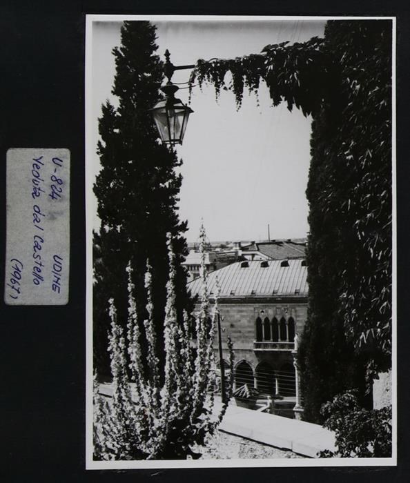 Udine: veduta dal castello. In secondo piano al centro, la Loggia del Lionello, finita di costruire per volere di Nicolò Lionello. Si intravedono il monumento alla Pace (in riferimento al Trattato di Campoformido) di Giovanni Battista Comolli (trasportato a Udine nel 1819) e la colonna con la statua della Giustizia, dello scultore Girolamo Paleari (1612), siti in piazza Libertà. Dietro la Loggia, il palazzo del Comune o Palazzo D'Aronco (1911-1930) con la campana d'arengo (1419), posta sul lato meridionale, in corrispondenza del caffè Contarena.