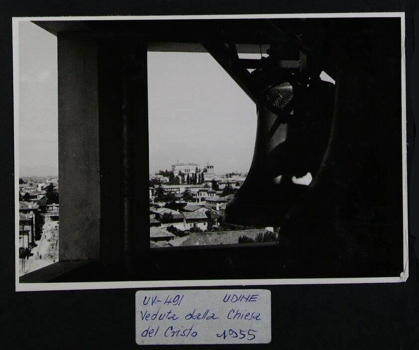 Udine, via Marsala: veduta dall'interno della sommità del campanile appartenente alla chiesa del Cristo, edificio religioso neoromanico costruito grazie al progetto dell'architetto Pietro Zanini (1926-1927). I lavori per il nuovo campanile si svolsero nei primi anni Cinquanta: nel 1954 venne celebrata la posa delle campane. In primo piano a destra, le campane. Sullo sfondo, verso il centro, il campanile del duomo, il castello e il campanile della chiesa di Santa Maria di Castello.